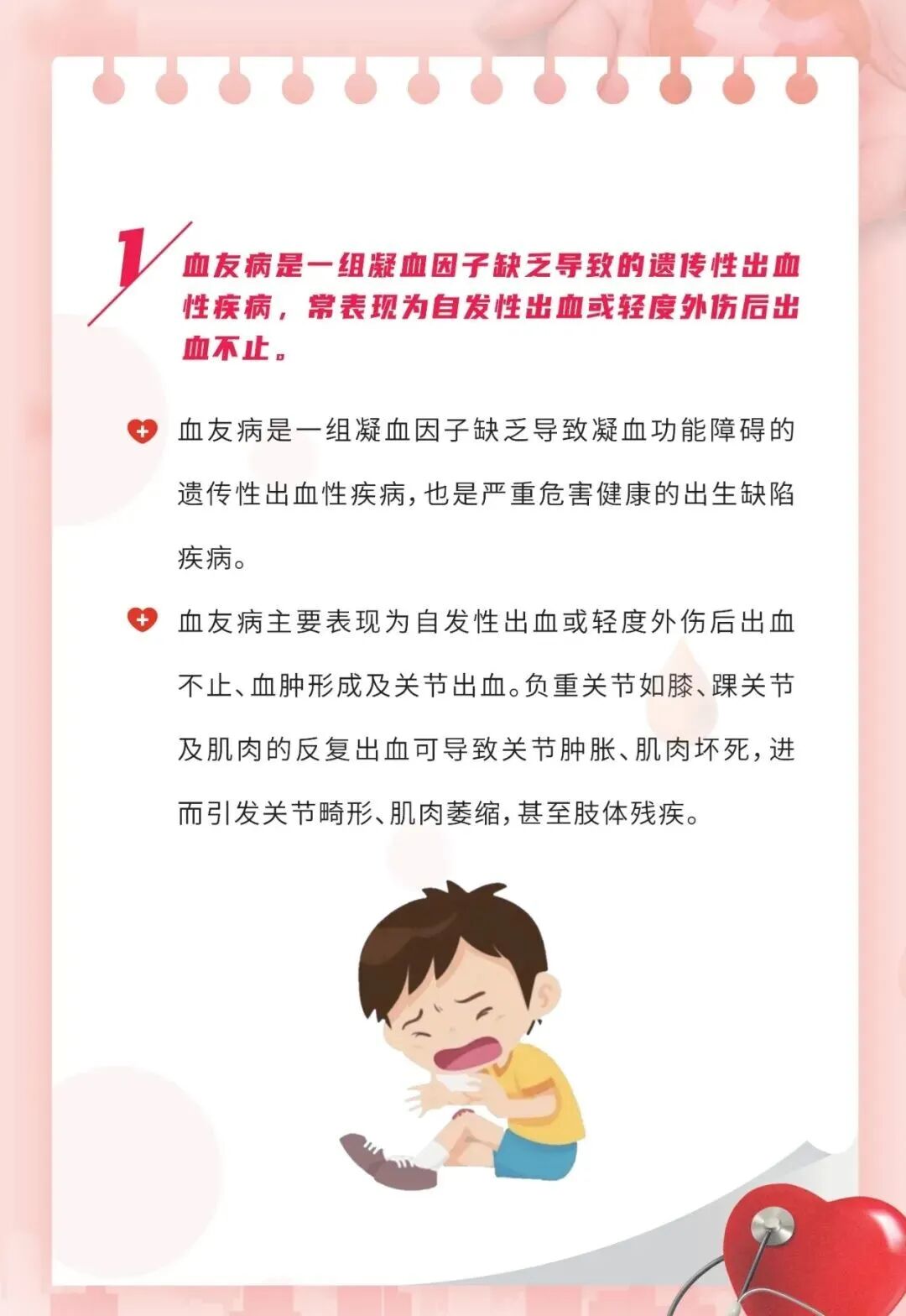 1、血友病患儿需要规范化的定期输注凝血因子预防性的治疗,补充体内的相应凝血因子的缺乏,以减少出血,减少关节畸形等伤残、减少死亡率。