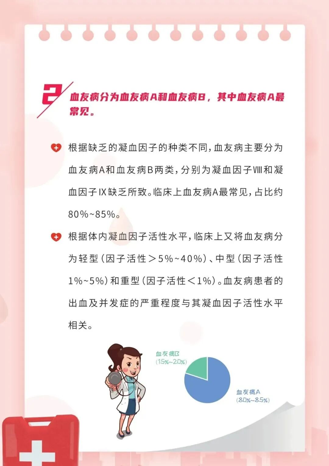 根据基因突变的不同分为血友病A(凝血因子Ⅷ缺乏症)和血友病B(凝血因子Ⅸ缺乏症)两型,血友病A占80%~85%,血友病B占15%~20%;