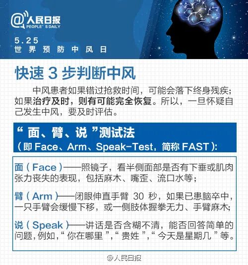 缺血性脑卒中发作超过4.5个小时就意味着错过了最佳救治时间窗口。卒中的发生,有明显的疾病信号。快速识别症状,及时寻求救治,是脑卒中急救成功与否的关键。