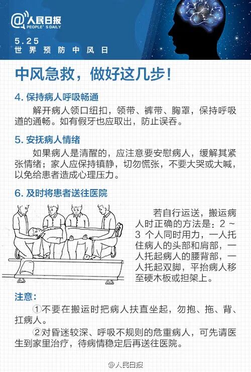 5. 不要舍近求远,必须分秒必争,马上送附近医院急救。因为脑卒中处理一刻值千金。