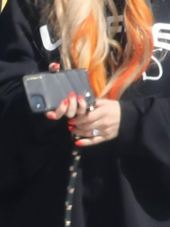 两个人已经相恋有一年的时间了,时间再到今年,4月6日,外媒拍到艾薇儿抵达洛杉矶工作室时,手上带着一个非常大的戒指,疑似订婚。