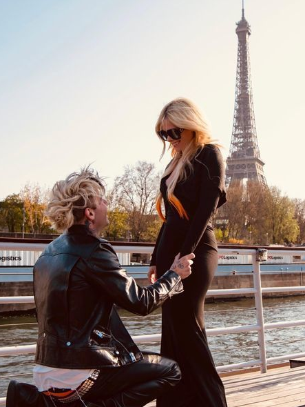 随后晒出的照片里,两个人同在塞纳河的一艘船上,可以清楚地看到埃菲尔铁塔。香槟畅饮,小提琴手演奏——艾薇儿说这个求婚是一个“完全的惊喜”。而从艾薇儿的表情看,她很是惊喜。