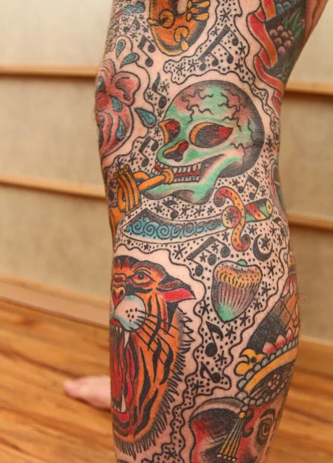 如果你期待五颜六色的彩色纹身,那你看Marc Durrant杜兰特就对了,杜兰特从小在宾夕法尼亚州匹兹堡长大,但自从 90 年代从雪城大学插画专业毕业后,一直在洛杉矶工作和生活。最初搬到洛杉矶是为了拍电影,但是没想到最后的职业却和电影没什么关系——他成了一名纹身家。