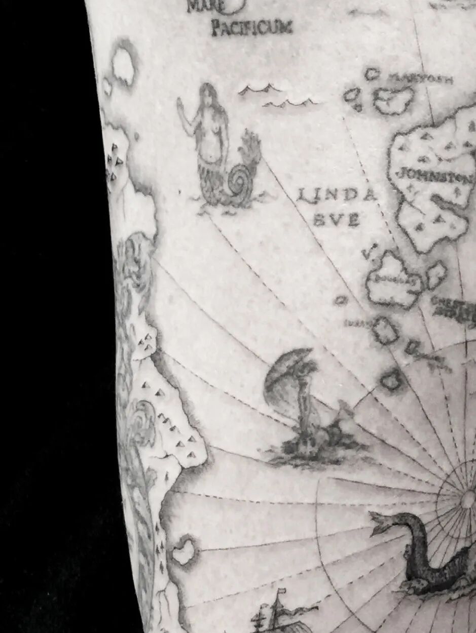Woo的第一个纹身是由我们这篇提到的第一个纹身艺术家马克·马奥尼完成的,当时的Woo以学徒的身份在马尼奥的工作室里潜心学习数年。等到技巧成熟后,Woo 开始在他的导师马奥尼身上练习,并发展出他自己独特的纹身细纹和复杂的设计技巧。