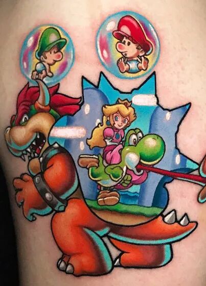 他的纹身作品从日本动漫到西方卡通的各种创意纹身艺术;从电子游戏到漫画英雄。这些他都表明,这些创意来自超现实主义方法,他迷恋这种精美质感和充满活力的色彩艺术纹身。