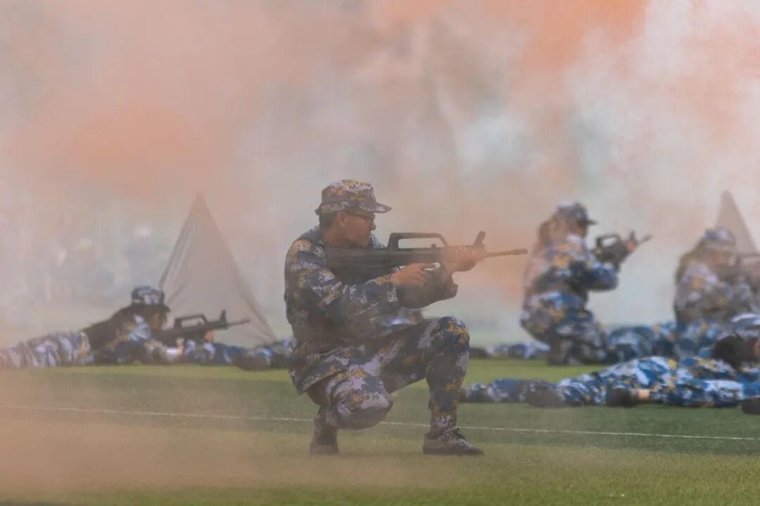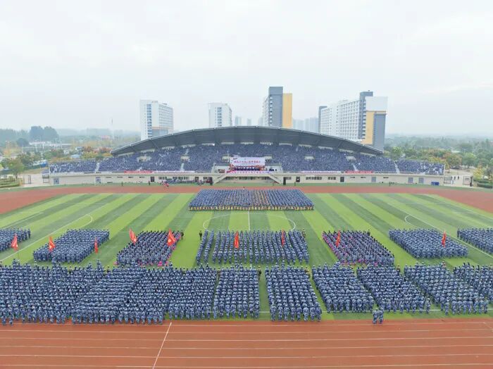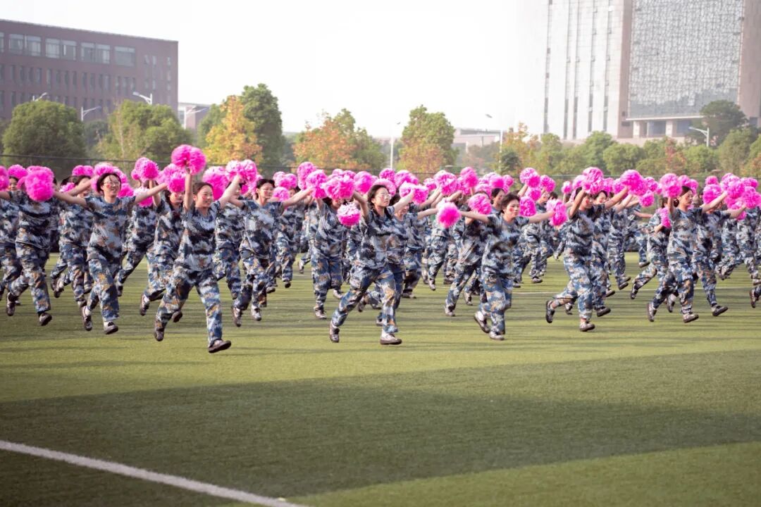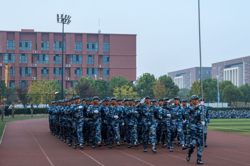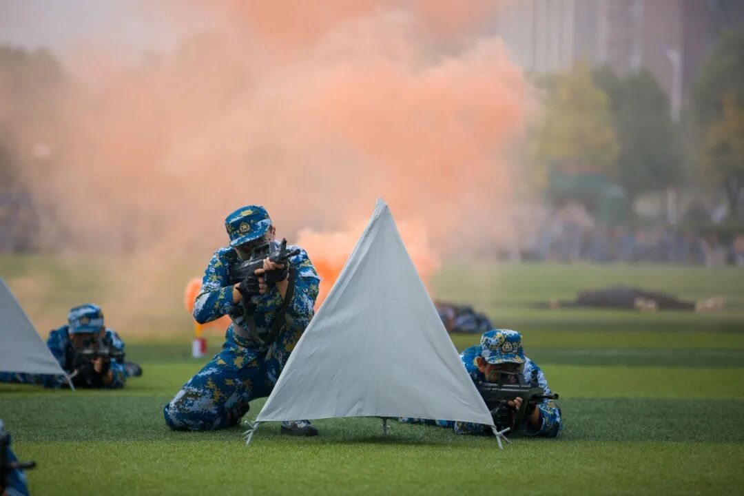 14天军训的磨练,使新生们褪去稚气,增添军人的气魄。瞧!意气风发的他们正阔步向前。伴随着雄壮的阅兵进行曲,在国旗、校旗方队的引领下,由17个学院2022级学生组成的军训团方阵,迈着矫健的步伐,以飒爽的军姿、整齐的队列、饱满的精神依次通过主席台接受检阅,展示了军训刻苦训练取得的骄人成果。随后进行的特色科目汇报表演精彩纷呈,匕首操、格斗术表演刚劲有力,气势如虹;军体拳表演出拳如虎,干净利落;战术动作表演精准出击,一招制敌,尽显军人热血;韵律操表演,活力四射、青春朝气,充分展现了同学们昂扬向上的精神风貌。