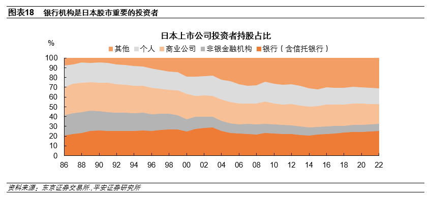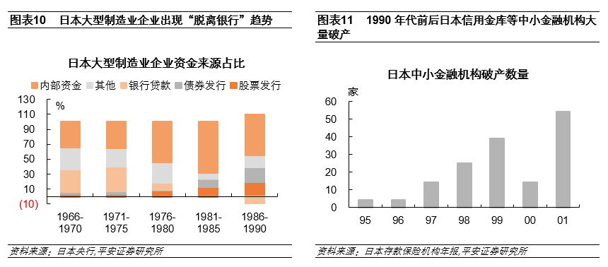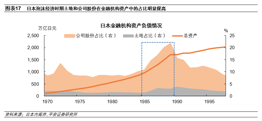 2、日本金融系统与实体经济过度绑定,使得房地产泡沫破裂产生了更广泛深远的影响。主要体现在:一是,实体企业过度参与金融投机活动。尤其是非金融企业部门大规模购入土地,当土地价格出现下跌时,实体企业资产负债表受损更为严重,进而出现“资产负债表衰退”;二是,“主银行”制度将金融机构、资本市场与实体企业三者牢牢绑定,加剧了金融风险的扩散。一方面,泡沫经济时期股票、土地在日本金融机构资产负债表中的占比不断提升,另一方面,银行在资本市场,尤其是股市中的参与程度更高。