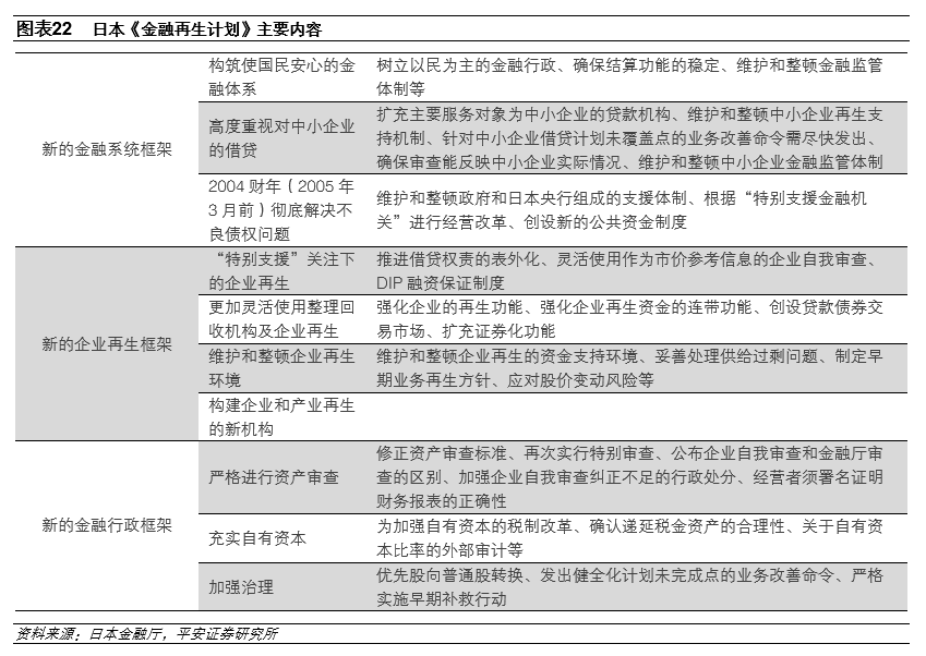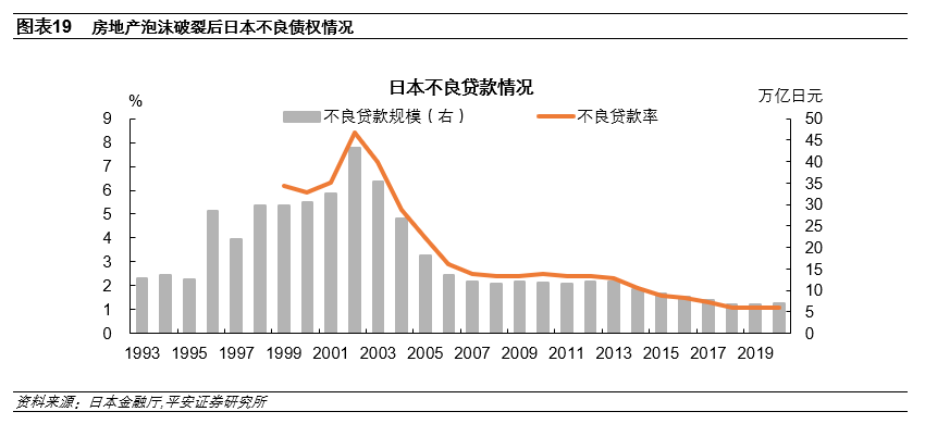 3、房地产泡沫破裂后,日本政府对不良债权的处置滞后,错过了最宝贵的时间窗口。泡沫破裂初期,日本各界均未意识到不良债权将会带来严重后果,政府仍然尝试延续大型金融机构并购中小型金融机构的处理方式,但这反而加重了大型金融机构的经营风险。直到小泉政府上台提出《金融再生计划》,加速不良债权处理,同时配套实施强化监管与治理的措施,提高银行自身的竞争力,日本不良贷款问题才逐步得到解决。