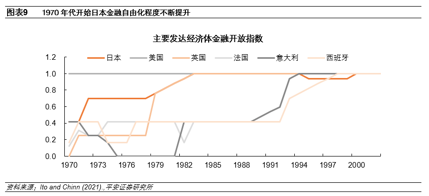 1970年代开始,随着日本经济由高速增长转型中速增长,日本政府对于金融系统的诸多管制使得其金融系统不再适应国内外的经济环境。日本金融体系与国内外经济环境间的“不兼容”主要体现在以下方面:首先,随着经济的不断发展,日本企业的自有资金不断增加,直接融资的渠道亦不断拓宽,通过银行等金融机构进行外部融资的需求减弱,以利率管制等方式人为压低利率的必要性也不断降低。1955年至1972年,日本非金融企业现金和存款占总资产的比重由9.40%提升至15.54%,企业自身资金充裕程度明显提升。而在1973年至1990年,日本非金融企业现金和存款占总资产的比重持续保持在12%以上的相对高位,直至房地产泡沫破裂后才出现大幅下滑。从融资方式来看,1980年至1989年,日本企业外部融资中直接融资的比重也由11.9%上升到27.0%。其次,1970年代开始日本政府大量发行国债,并由银行等金融机构承销。当时日本政府为使国债发行不影响到利率管制,对国债发行和流通市场均实施了严格管理。但金融机构以低于市场的利率承销国债,严重影响了其流动性和收益性,并造成了金融机构资金短缺,于是金融机构强烈要求在市场上卖出国债。压力之下,日本政府开始逐步放开国债利率管制,并走向了通往利率市场化的道路。1977年,日本开始放宽对金融机构所持国债的管制,允许商业银行承购的国债自由上市流通。此后,日本政府陆续放开了对银行间拆借利率、银行间票据利率、大额可转让存单(CD)利率等的控制,并于1994年实现了除活期存款利率以外的完全利率市场化。再次,1970年代开始,随着日本经济的高速增长,外资金融机构开始要求日本进一步开放其国内金融市场。与此同时,日本国内金融机构也开始参与海外投资,并要求本国监管机构放松管制。在此背景下,日本和美国成立了由政府专家组成的日元/美元汇率、金融和资本市场工作组。1984年,日美联合特别工作组起草的“关于日元/美元汇率、金融和资本市场问题报告”公开发表,明确日本应采取存款利率自由化、金融业务多元化、促进货币市场发展等措施来实行金融自由化。最后,随着日本国民收入的提高,其对金融产品的需求趋于多样化和复杂化,许多新金融工具、新金融市场开始出现,而这也意味着对分业管制和利率管制的打破。因此,为使日本金融体系适应国内外经济环境的变化,日本开启了一系列金融自由化改革。在此期间,日本政府以渐进式改革方式推行利率自由化、金融机构经营自由化以及资本流动自由化改革。根据Menzie Chinn和Hiro Ito编制的金融开放指数(The Chinn-Ito Financial Openness Index),1970年后日本金融开放程度明显提高,甚至一度高于法国、英国等国家。日本政府的金融自由化改革虽然使得金融系统的活力明显提升,但也为后续日本房地产泡沫的膨胀与破裂埋下了伏笔。一方面,随着资本市场的开放,日本国内企业的融资渠道开始由银行扩展至股票、债券市场,资质较好的大型制造业企业开始出现“脱离”银行的趋势,1986年至1990年日本大型制造业企业从银行的融资额甚至为负。银行为了应对这一趋势,被迫将重点转向扩大与中小企业之间的业务,中小企业获得的贷款规模急速增长。日本商业银行对中小企业的贷款余额由1984年的105万亿日元增长至1989年末的247万亿日元,而同期对大企业的贷款余额仅增长了不到3万亿日元。而中小企业获得贷款后,并未全部用于生产经营,多数资金流入到房地产市场。因此,中小企业贷款规模的急速扩张,不仅助推了房地产泡沫的膨胀,也使得银行资产质量出现了明显的下降。房地产泡沫破裂后,以中小企业为主要客户的中小规模地方性金融机构(如信用金库)率先出现破产情况,1991年10月三和信用金库成为日本战后首家破产的金融机构。另一方面,在日本政府进行一系列金融自由化改革的同时,其金融监管体制的改革却相对落后,助长了房地产市场的泡沫。二战后日本政府对金融机构实行了过分的控制和保护政策,形成了“护送船队”模式的金融监管体系 ,以至于出现了“日本金融机构不倒”的神话。进入1980年代以后,虽然金融自由化的步伐加快,但政府并未完全放弃对银行经营的干预,从而使银行形成了政府将继续提供隐性担保的预期。因此,在诸多金融管制政策放松后,许多银行采取了较为激进的经营策略,在贷款审查、投资审核等方面过分放松,许多银行甚至通过贷款给信托公司等机构使银行资金直接流入股市及房地产市场,加剧了资产泡沫的膨胀程度。根据野口悠纪雄(2005) 的研究,1984年末至1990年末日本银行对非银行金融机构的贷款规模由15.1万亿日元增长至40.2万亿日元,其中约有10.8万亿日元新增贷款流入了房地产市场。