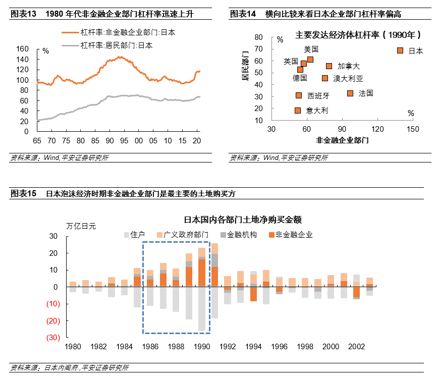 2)日本金融系统与实体经济深度绑定,使得房地产泡沫的破裂产生了更广泛且深远的影响。一是,实体企业过度参与金融投机活动,非金融企业部门成为土地的主要购买者,杠杆水平也不断提升。二是,“主银行”制度下,银行既是企业最大的债主,也是其最大的股东,土地、股份在银行资产负债表中占据重要地位,金融机构、资本市场与实体企业三者之间紧密联系,加剧了金融风险的扩散。