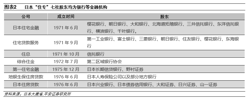 日本是二战后第一个由发展中经济体跨入发达经济体的国家。日本经济从“高速增长-中速增长-长期停滞”的换挡、作为世界第二大经济体一度遭遇美国战略遏制、人口的老龄化、房地产泡沫的形成与破裂、产业结构的变迁等,对当前中国经济发展提供了较为丰富的历史借鉴。对日本发展历程的对照性回顾,一直是中国宏观经济研究的重要内容。在国际局势波诡云谲,中国着力构建新发展格局的当下,重读历史会给我们带来新的启示。为此,我们推出“日本启示录”系列报告,着眼当前中国经济发展中呈现出的新问题,寻找这个前世界第二大经济体带来的启示。本系列的第一篇系统梳理泡沫经济时期日本土地、人口、政策相关状况,探究日本房地产泡沫膨胀与破裂的根源所在。但仅从土地、人口、政策方面,显然难以还原上世纪九十年代日本房地产泡沫膨胀与破裂的全貌。作为“日本启示录”系列的第二篇,本文尝试从金融体系和实体经济等方面,进一步探究日本房地产泡沫膨胀与破裂的始末。“住专”全称为住宅金融专业公司,是日本专门从事住宅信贷和房地产信贷的民间信用机构。根据日本政府此前规定,金融机构不能为个人购买房地产提供抵押贷款。为绕过这一限制,1971年部分银行联合出资成立了日本第一家以办理个人住宅抵押贷款为主要业务的住专公司——日本住宅金融会社。住宅金融专业公司最初成立目的是为了加强其股东银行在住宅抵押贷款业务上的竞争力,因此“住专”自身资金来源主要为同业拆借,其自身并不吸收公众存款。