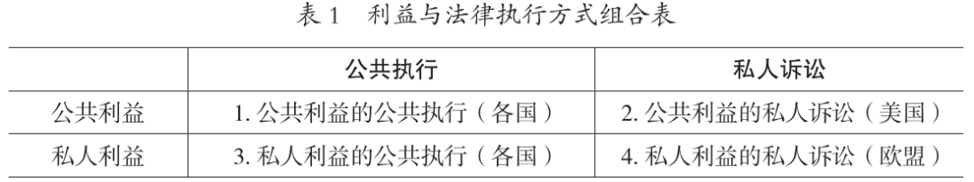 尽管世界各国存在着不同的模式,同一个国家也会存在着不同的可能,且受制于特定的历史、制度、文化等各种要素,但正确理解大陆法系和英美法系的上述区分是非常重要的。在学理上,通常将来自不同立法例的模式进行横向比较,但显然,对于反垄断的民事诉讼机制而言,需要在理论上理解和澄清私人执行的反垄断法和民事诉讼求偿之间的差异。这种不同表现为法律执行目的上的公共利益和个人利益之区分,以及法律执行方式上的公共执行和私人执行之区分,据此可以做出以下组合: