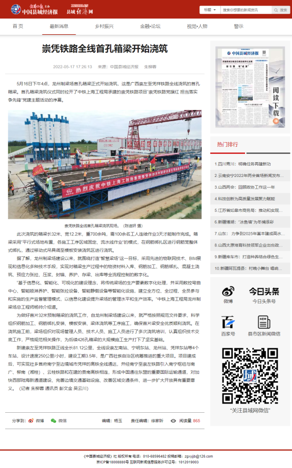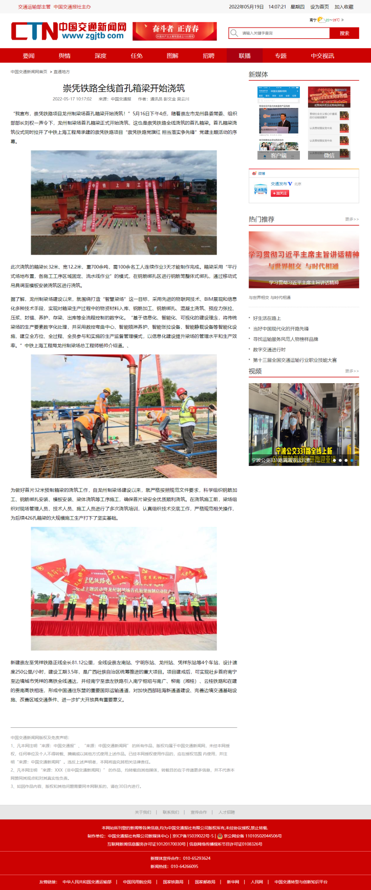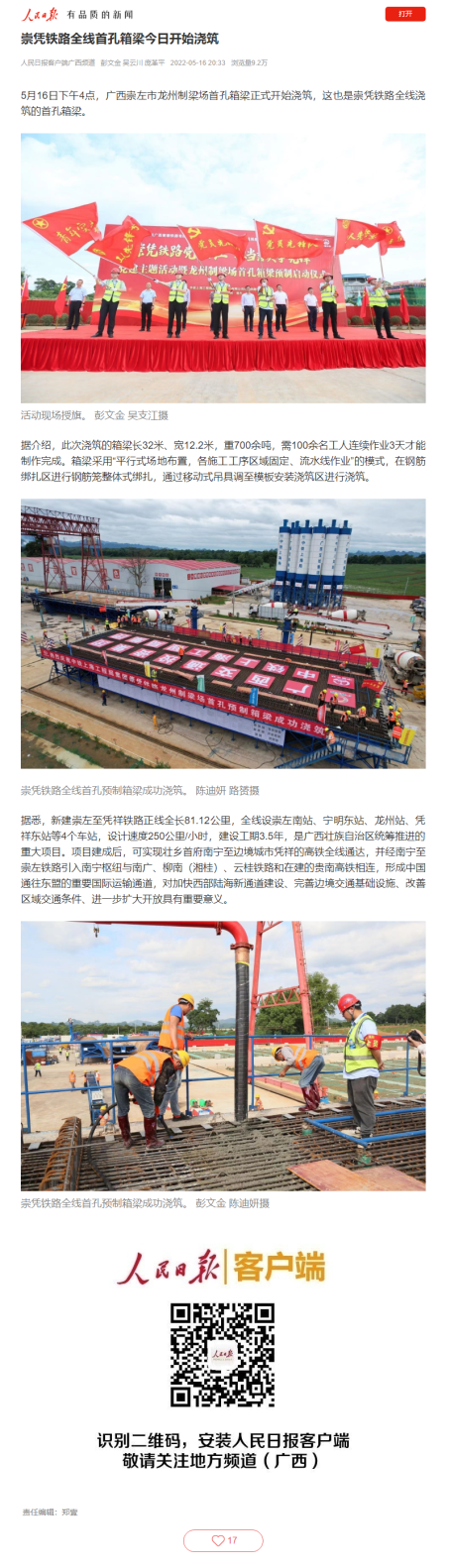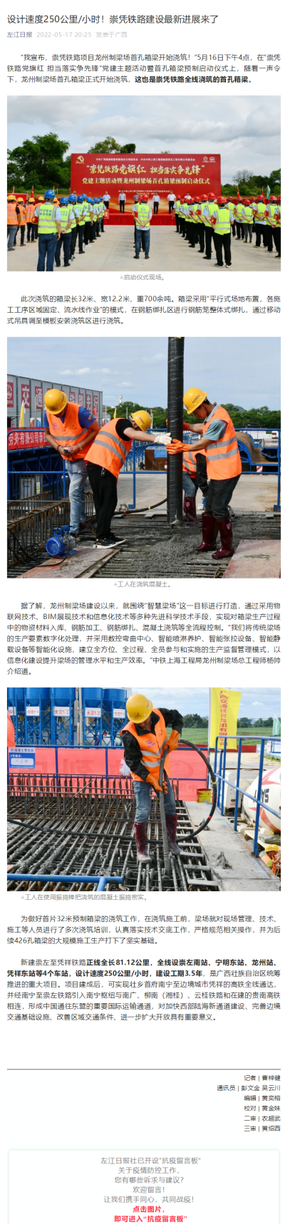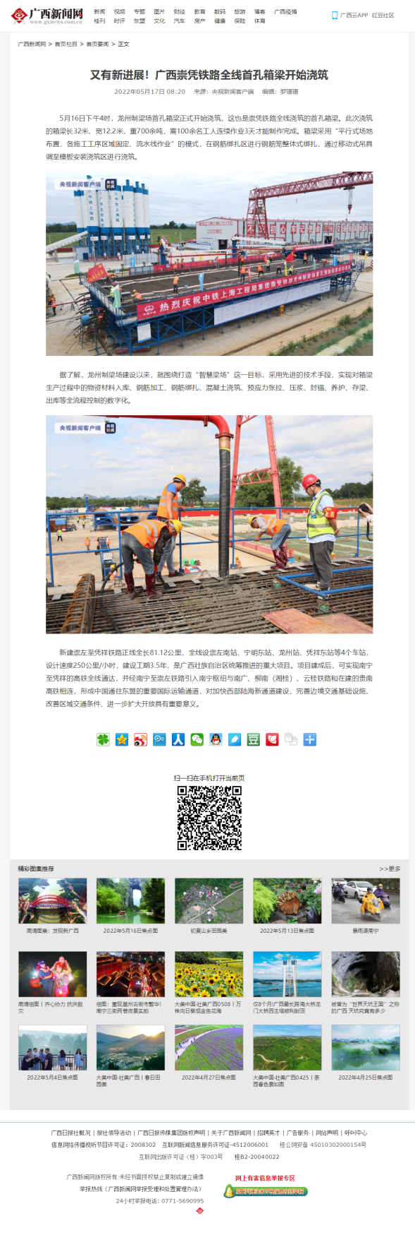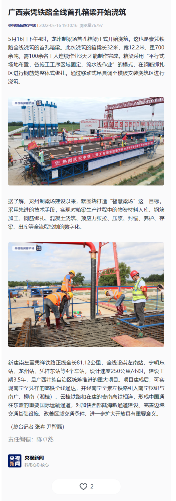 5月16日,中铁上海工程局承建的崇凭铁路龙州制梁场首孔箱梁正式开始浇筑,这也是崇凭铁路全线浇筑的首孔箱梁。