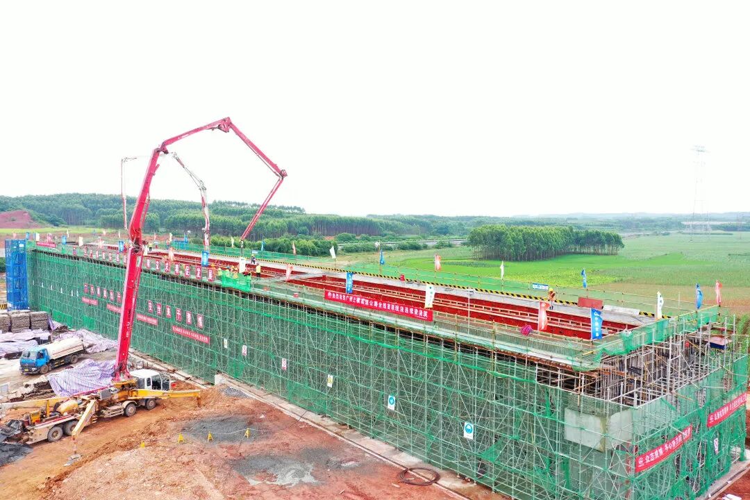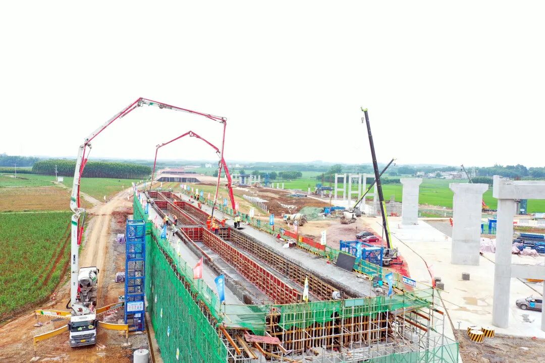 据了解,上横高速公路是《广西高速公路网规划(2018-2030年)》中“1环12横13纵25联”的布局方案中的联16线,连通南宁市上林、宾阳、横县(横州市)三县,全线位于南宁市境内,建设工期4年。由中铁上海工程局承建的第二合同段位于宾阳县境内,施工里程22公里,施工内容主要包括路基19.98公里、涵洞通道102座、预制箱梁合计658榀、土方开挖401万方、土方回填585万方、服务区1处。其中黎塘北枢纽是该工程的重难点之一,此次浇筑施工的首联现浇连续梁长110米,共需浇筑C50混凝土1001.1m³。