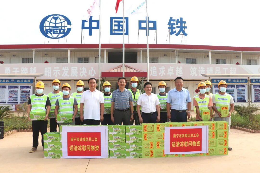 8月4日上午,南宁市武鸣区政协党组副书记、政协副主席、总工会主席陆耀忠一行深入公司贵南高铁项目南宁北站工区开展“送清凉”慰问活动,为高温下坚守施工一线的广大产业工人送去工会组织的关心和关爱。武鸣区总工会党组书记、常务副主席李茂叁,公司党委副书记、工会主席侯杰参加活动。