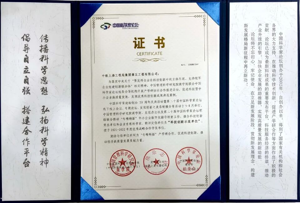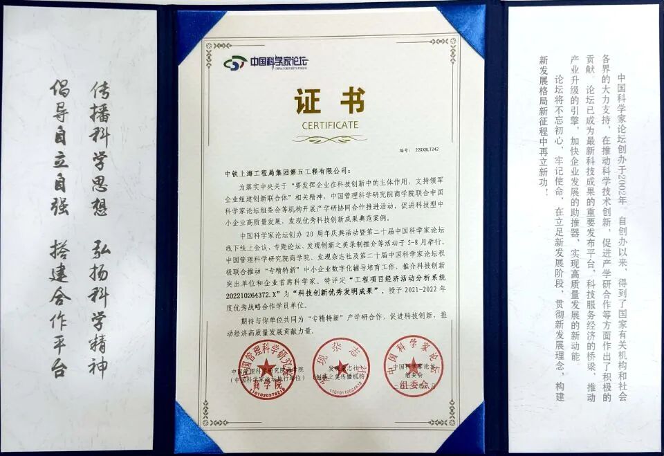 8月13日,“第二十届中国科学家论坛”以线上、线下形式在京举行,公司被评定为“科技创新示范单位”,公司“工程项目经济活动分析系统”被评定为“科技创新优秀发明成果”。