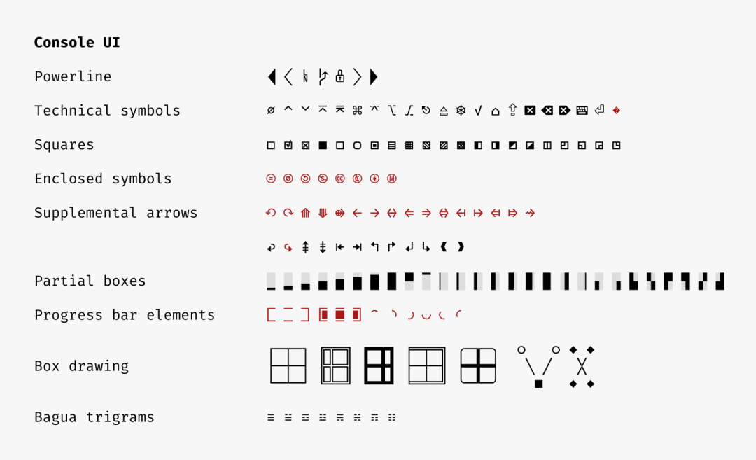 这款字体充分考虑了长时间查阅代码可能导致的眼睛疲劳问题,以及与之相关的因素,比如字母的大小和形状、字形之间的空间量、自然等宽平衡、不必要的细节、以及难以区分的符号或字母(l 和 I)和连字等。
