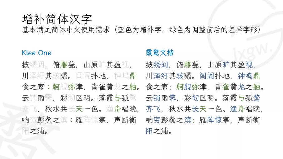 霞鹜文楷衍生自开源字体 Klee One,后者是一款日文的教科书字体,由日本著名字体厂商 FONTWORKS 打造,兼有仿宋和楷体的特点。霞鹜文楷基于 Klee One 补全了简繁常用字。