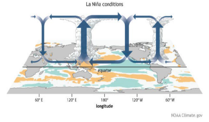 拉尼娜主要指太平洋中东部海水异常变冷的现象,信风带(南北纬5-25°附近,副热带高压向赤道低压运行,北半球东北信风,南半球东南信风)将表面被太阳晒热的海水吹向太平洋西部,导致西部海水温度增高,与此同时东部的底层冷海水上翻,使得东太平洋海水变冷。当东西部太平洋的海水温度持续偏离正常值,拉尼娜现象就可能出现。