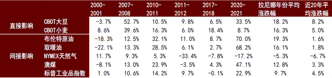 由于拉尼娜气候会对农作物生长造成一定程度的影响,市场普遍担心拉尼娜会造成当年作物减产,从而带动农作物市场价格出现波动。从历史数据看,我们梳理了自2000年以来,在最近6次拉尼娜发生的年份中,大宗商品价格波动情况,其中除大豆、小麦首当其冲,相关能源和工业品也会受到一定波及,具体如下: