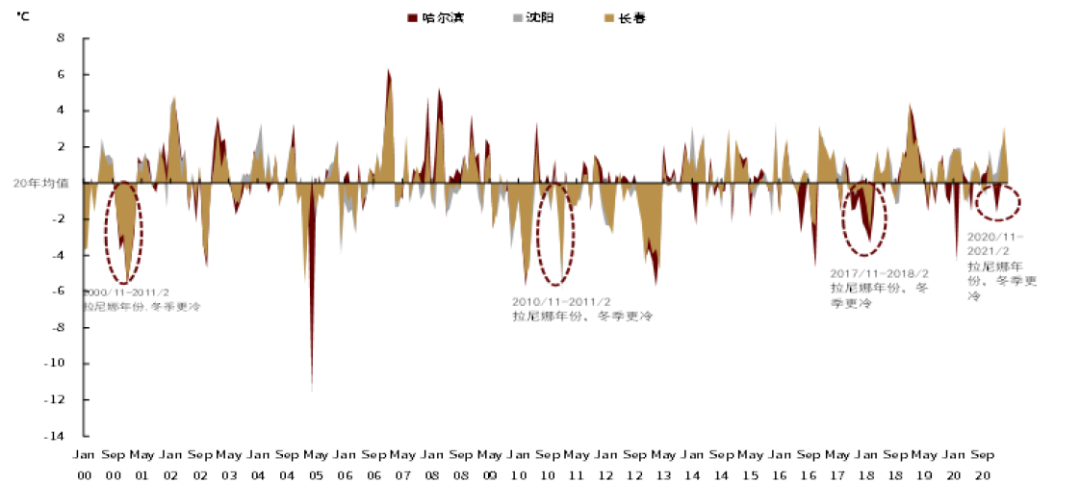 ► 天气因素扰动或将加剧相关农产品价格波动。2000年后,北半球冬季共发生6次拉尼娜气候,我们发现,CBOT大豆价格在拉尼娜冬季(当年11月-次年2月)有5次发生上涨,平均价格上涨18.2%(20年同期平均涨幅为8.2%);CBOT小麦价格有6次发生上涨,平均价格上涨16.3%(20年同期平均涨幅为8.2%)。