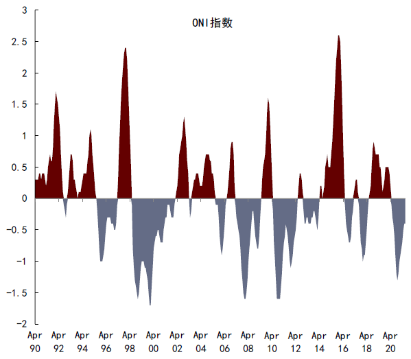 经历过2020年拉尼娜导致的冷冬后,2021年6月,热带太平洋温度出现ENSO中性条件,NOAA宣布从2020年延续到2021年的拉尼娜现象消散,全球气候开始趋向正常。然而,2021年8月,NOAA宣布拉尼娜现象有再次上演的迹象,气候再次反转在即,市场普遍关注2021年是否真的会“双峰拉”,如果出现,对于大宗商品影响几何?