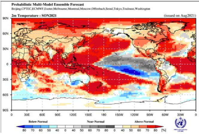 ►海水表面平均温度异常(SST Anomalies): 使用ONI(Oceanic Niño Index )来表示Nino 3.4区域[[1]]3个月的海温距平值的移动平均值,如果ONI指数连续5期超过阈值-0.5°C,定为一次拉尼娜事件。通过NOAA9月气象监测数据显示,赤道中太平洋和东太平洋持续低于平均海面温度 (SST),ONI值为-0.46℃。