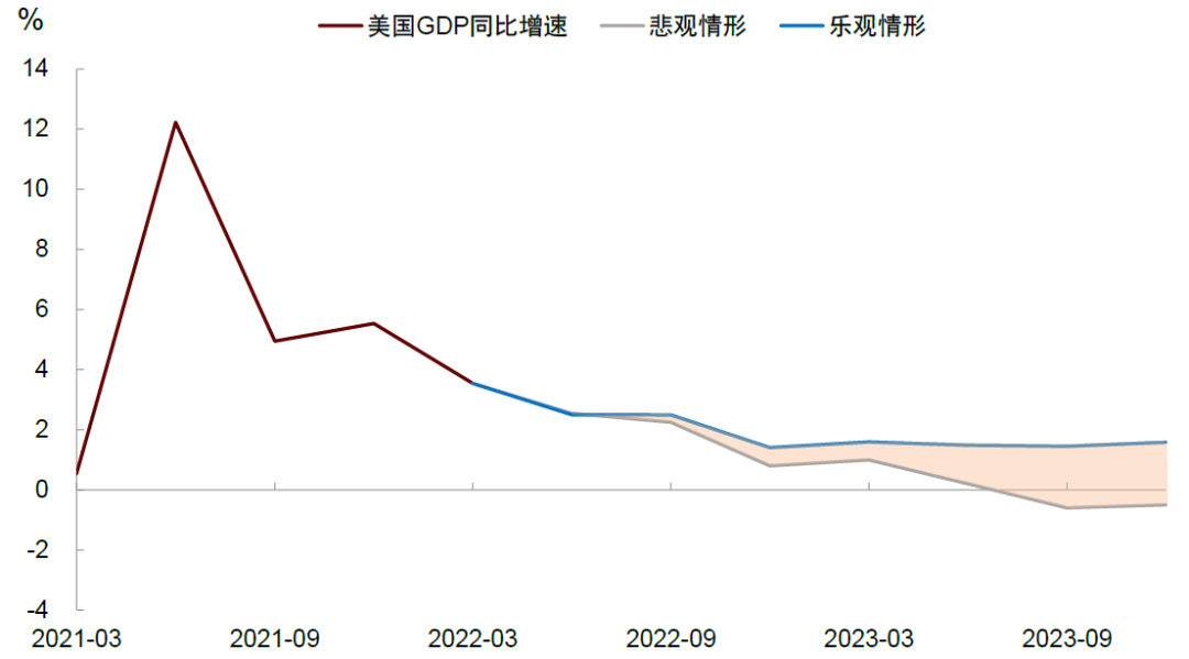 ►悲观情形下,我们预计美国经济在2022年实现“稳增长”,但在2023年出现衰退,比较可能的诱因是货币供给收缩导致经济超预期走弱。如前所述,下半年美联储“缩表”导致基础货币下降,而私人部门信贷受到“去金融化”限制,扩张的力度或有限。两个因素叠加,可能导致下半年M2增速下降较多,从而增加明年经济的下行压力(此处考虑M2对经济的影响滞后约2个季度)。这里的逻辑在于,货币供给下降使得实体经济的信贷需求得不到满足,进而阻碍总需求扩张。此外,如果货币供给收缩引发流动性风险,还可能导致信用超预期收紧,银行出于风险管理的考虑也会“惜贷”。企业偿债压力上升,“迟到的破产”也可能兑现。这种情况下,我们预计2023年GDP增速将降至零增长,美国经济最快在2023年上半年就出现衰退迹象。