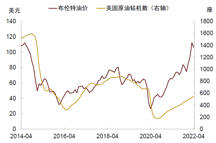 疫情后海外企业资本开支总体偏弱,传统能源行业投资受到抑制。根据OCED固定资产投资指数,截至2022年一季度,多数国家的实际投资增速仍低于疫情前趋势。美国相对好一点,但增速也不及疫情前水平(图表26)。我们认为这可能与疫情带来的不确定性有关。投资的沉没成本高,具有一定的不可逆性,不确定性越高的时候,企业越不愿意投资。此外,受绿色转型和“碳中和”政策影响,美国油气行业扩张受限。以往油价上涨后美国原油钻机数会迅速上升,但这次明显滞后(图表27)。换句话说,美国油气行业的投资弹性下降了。