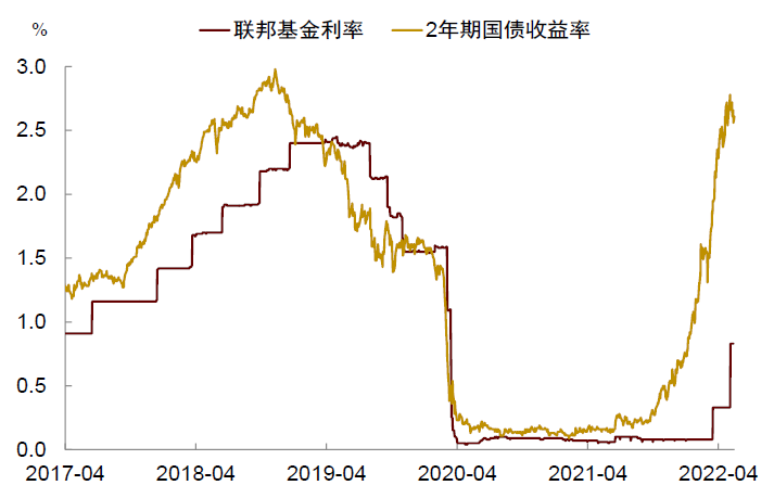 为防止通胀失控,美联储货币政策转向紧缩。年初以来,美联储对货币紧缩的态度不断强化,2年期美国国债收益率领先联邦基金利率大幅上行,表明市场对货币紧缩的预期一直在升温(图表6)。与以往相比,本轮美联储紧缩起步晚、转向快、节奏紧。过去半年,美联储不仅大幅上调加息预测,还在加息开启后很快宣布“缩表”计划。为什么会这样呢?一个原因是去年美联储低估了通胀的持续性,致使货币政策严重落后于曲线。随着通胀超预期上升,美联储只能对前期的误判进行纠偏,从而造成政策“急转弯”。
