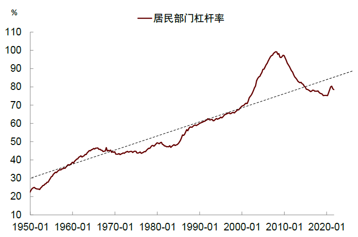 图表25:美国居民杠杆率低于长期趋势