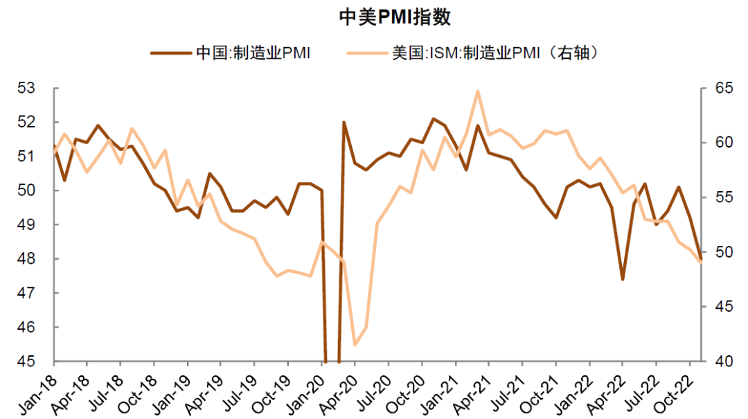 图表4:美国制造业PMI不断下行,中国制造业PMI低位振荡