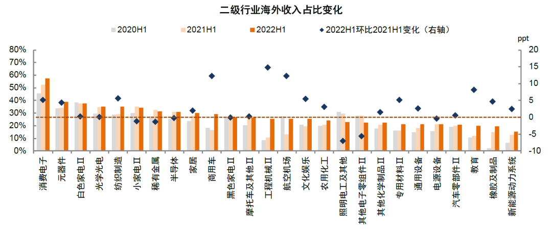 图表24:半导体、消费电子和新能源车产业链等赛道的海外收入占比相对较高