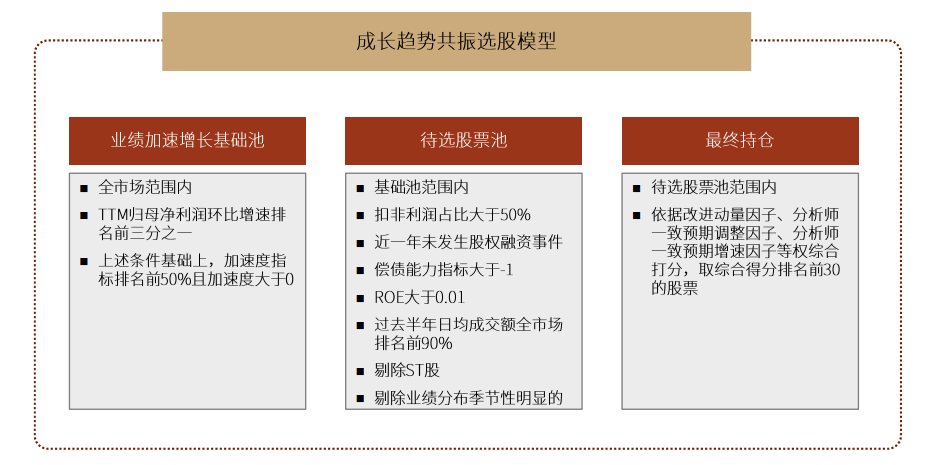 ► 业绩加速增长基础池:在全市场范围内,筛选TTM归母净利润环比增速排名前三分之一的股票,并在其中进一步筛选加速度指标排名前50%且加速度绝对值大于0的股票作为基础池。