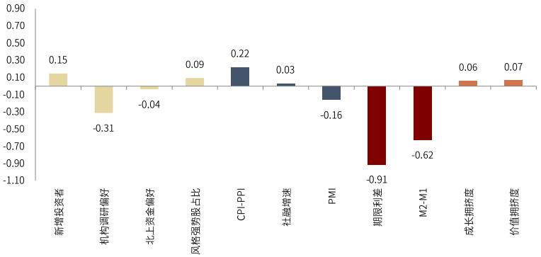期限利差、M2与M1的增速差与成长/估值因子收益具有较显著的相关性。