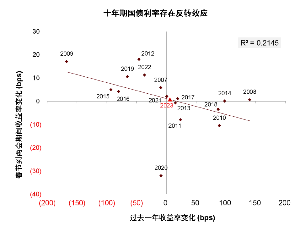 图表2:春节到两会期间利率变化与过去一年利率变化负相关
