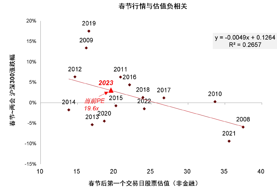 图表6:节后第一个交易日股市的估值越低,春节~两会期间股市涨幅越可观