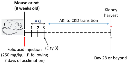 图1:叶酸(FA)诱导的急性肾损伤(AKI)和慢性肾病(CKD)的一般实验方案示意图