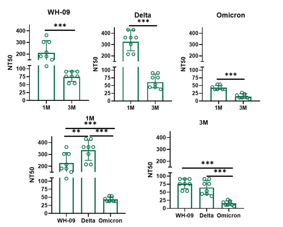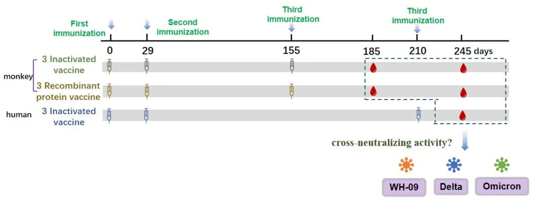 面对新冠病毒的不断变异,同源加强免疫的保护作用到底如何?围绕这个问题,中国医学科学院医学实验动物研究所新冠疫情攻关团队第一时间开展疫苗同源免疫是否对突变株具有交叉保护作用研究。设计将恒河猴分为两组,分别接种免疫灭活疫苗 (PiCoVacc)或重组蛋白疫苗(Anhui Zhifei Longcom Biopharmaceutical),通过检测中和抗体来评估不同类别同源加强免疫策略对原毒株(Wh-09)、Delta和Omicron的保护效力,并监测了完成3针灭活疫苗同源加强免疫的6名志愿者的中和抗体水平。