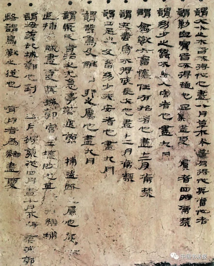 (四)墙壁题记,出自F26、F27房内,因最初写在室内墙壁上,后因墙壁坍塌而成碎块,出土大小不等的残块203块。大部分为长期涂抹多次书写的多层墙壁墨书,少部分为一次书写。经整理复原,F26:6比较完整,长222厘米、宽48厘米。用黑宽线勾出边框,中间用红色分隔号分栏,然后书写文字,共101行。题为《使者和中所督察诏书四时月令五十条》。