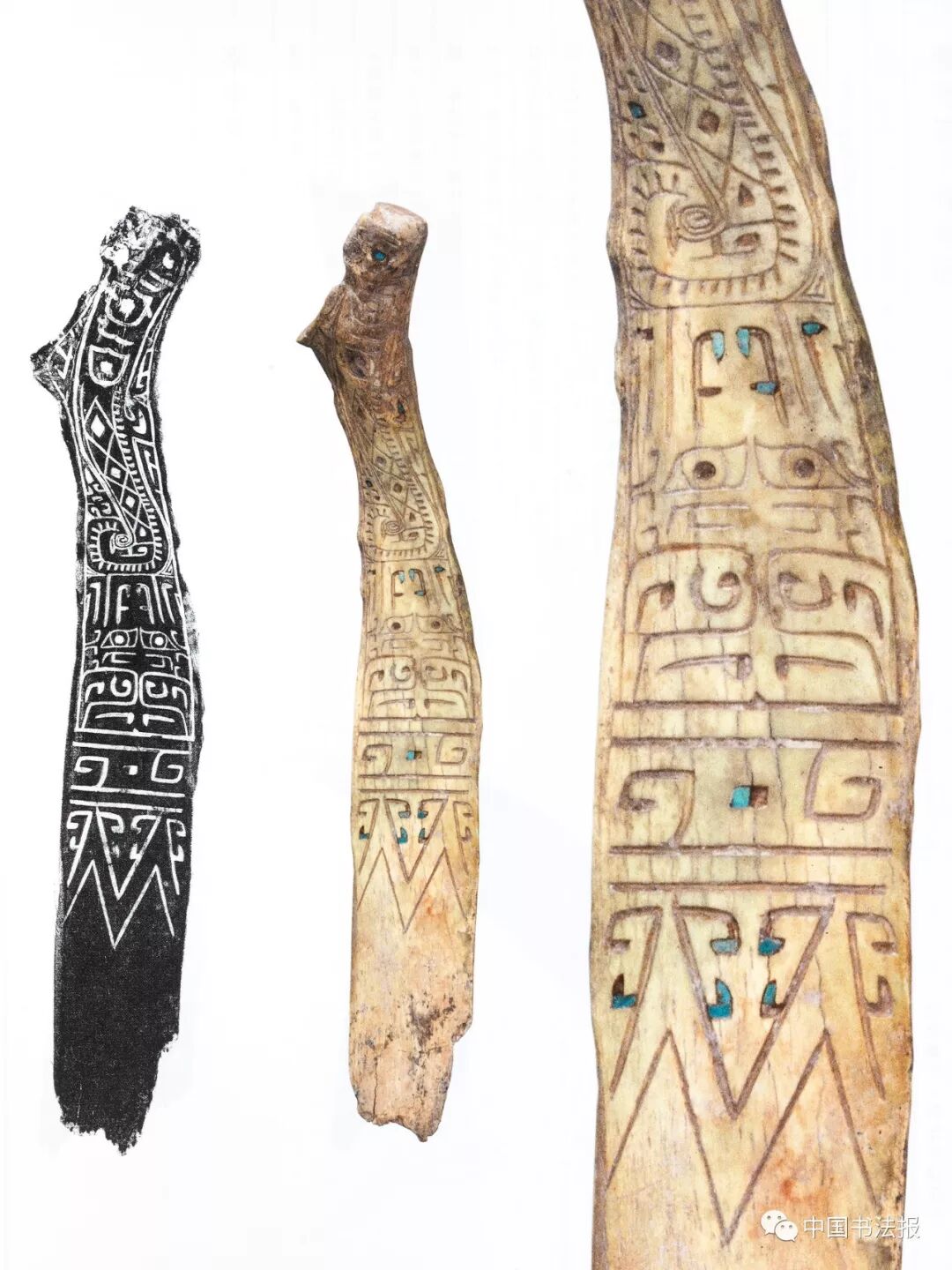 如果说,涂朱涂墨的甲骨并不罕见;那么,在刻痕中镶嵌绿松石的甲骨则异常珍贵,这便是国家博物馆中仅存的一件“宰丰骨匕记事刻辞”。