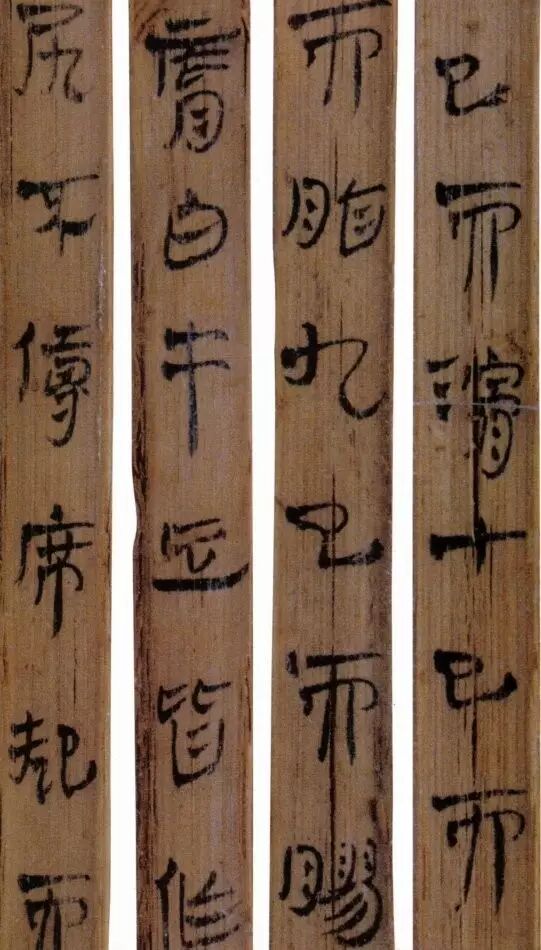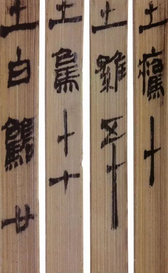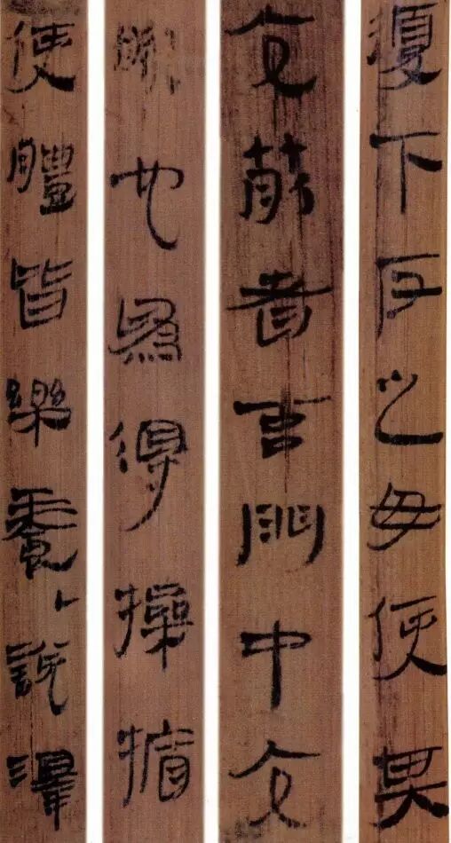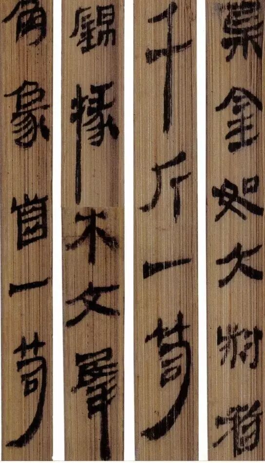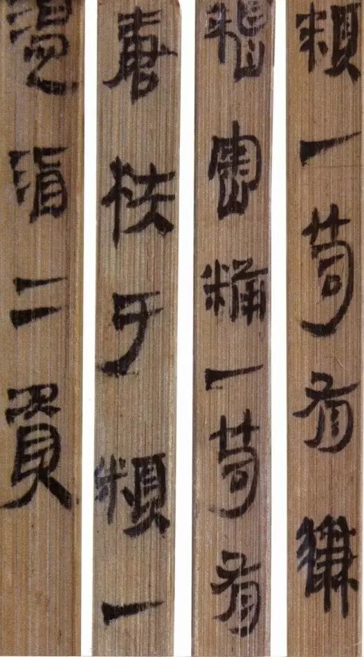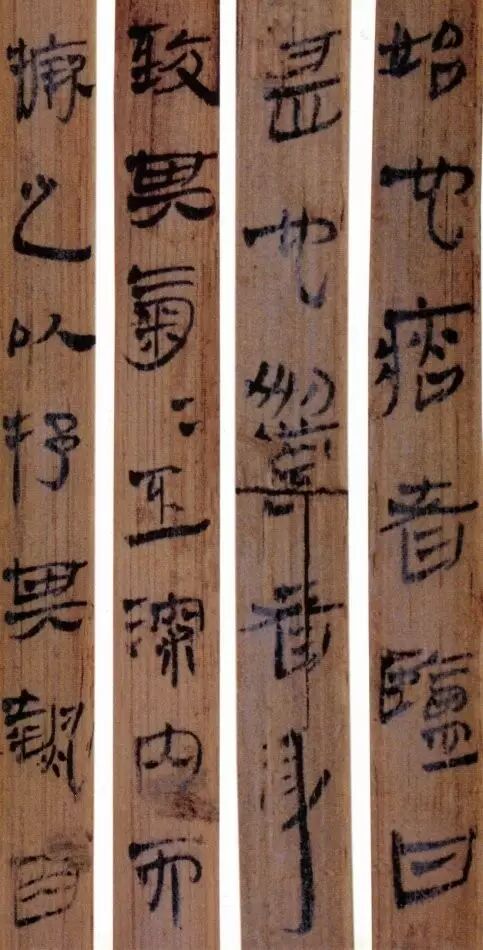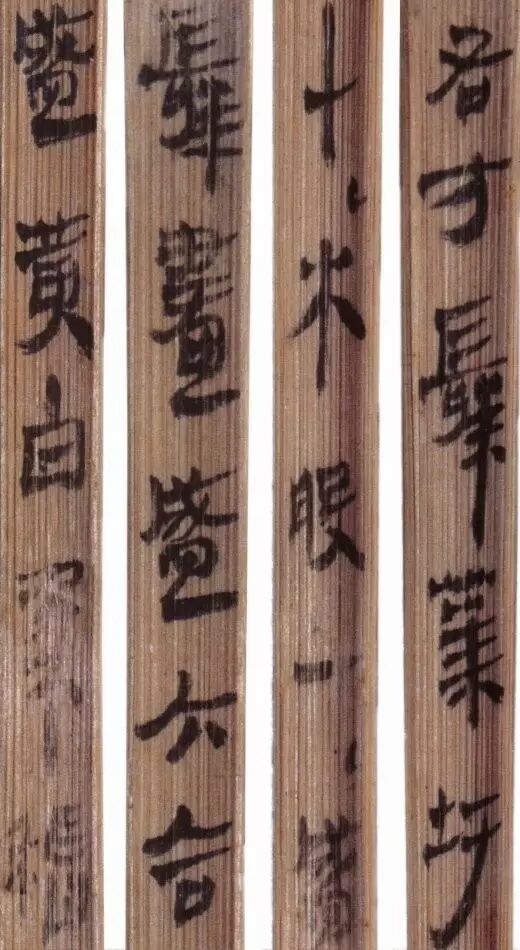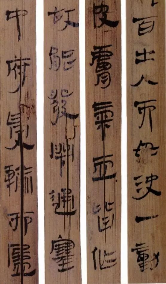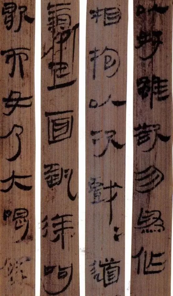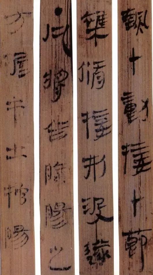 马王堆汉墓出土的大批帛书和竹简,在反映汉初文字的隶变情况方面最具代表性。《合阴阳》是马王堆三号墓出土的竹简。与《合阴阳》同墓出土的另有《十问》、《天下至道谈》、《杂禁方》、《遣策》等不同内容的四种简,还有其他内容的帛书。《合阴阳》一共有三二支简,简长为二三厘米左右,简宽为一厘米有余,每支简上的文字有二十余宇不等,其内容是对房中养生术具体技巧的描述,属于医简。这批简的简幅较宽,书写时便于发挥书法技艺。这批简的抄手在书法方面本身也有较高的造诣。这组简,从笔画上看,书写者颇能随心所欲地将刚柔不同的笔画揉合在一起。例如其横画,虽也如马王堆一号墓《遣策》上的文字一样,都讲究方起尖收,但在其方起处就往往兼有圆笔或点墨,其用笔就并不太着意于棱角的分明与否。至于其折笔则方圆并重,或一笔弯下,显其圆转流畅,或分笔相连,呈其刚劲遒健。从文字构形上看,其中宫紧凑,四周舒展,左右避让,上下呼应,顾盼有情。特别是其波挑披拂之处,神采飞扬,极尽波磔俯仰之能事,有一种变化奇丽的特殊意蕴。再从整体布局上看,其一简之内的黑白布局随立思自然,疏朗有致,毫无匠气而显得神采飞扬,赏心悦目。因此,无论从哪方面去品评,这批简的书法艺术都是汉简书艺中的上乘之作。