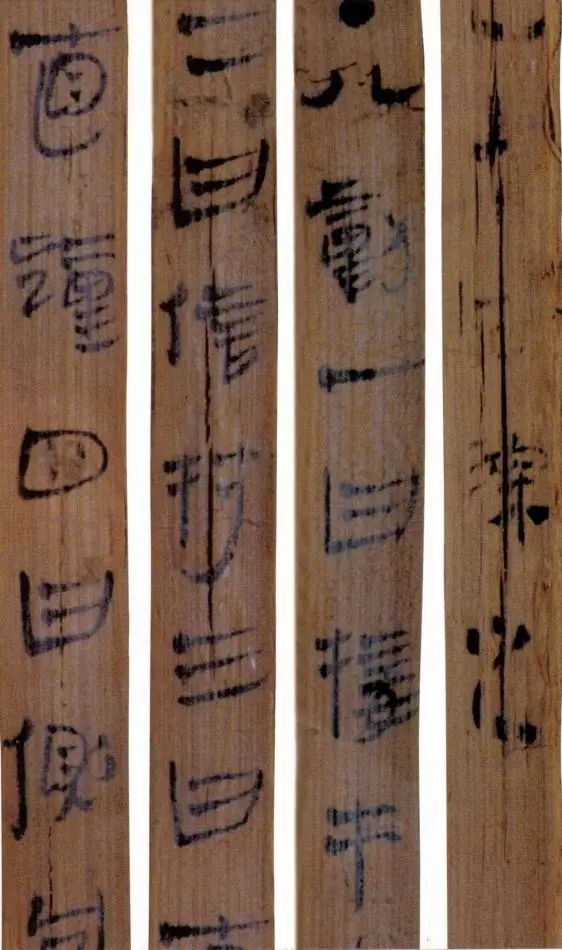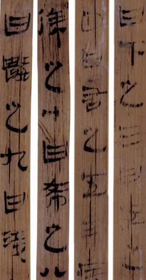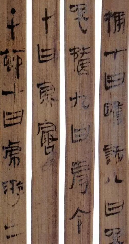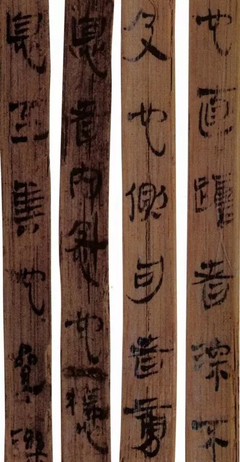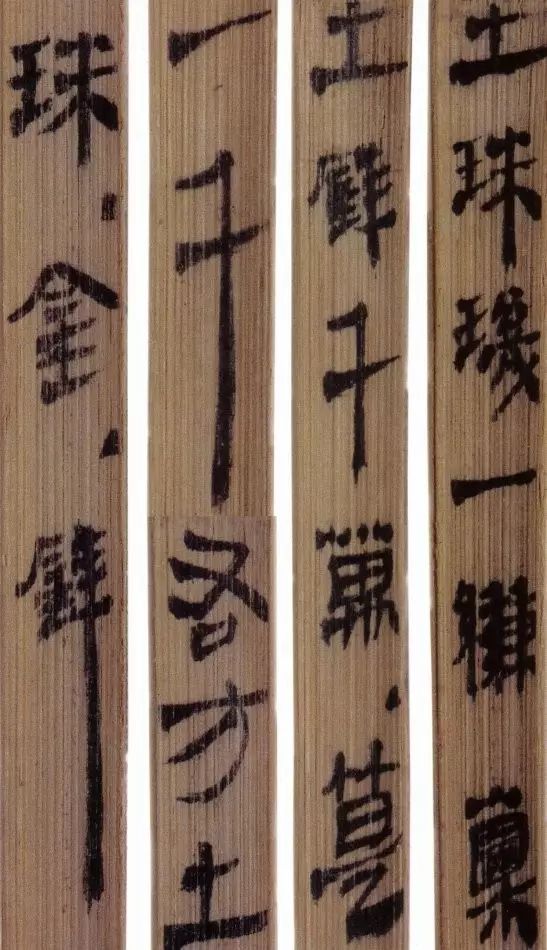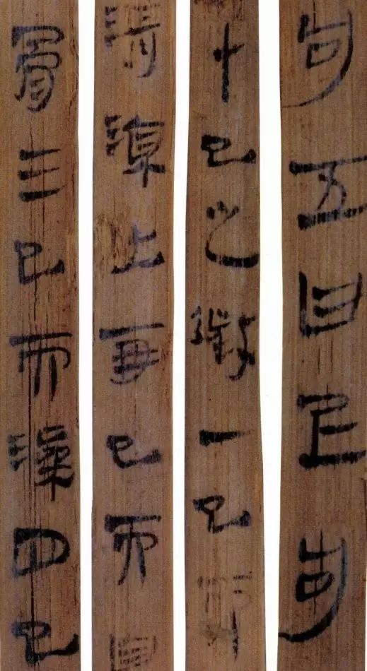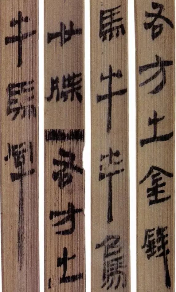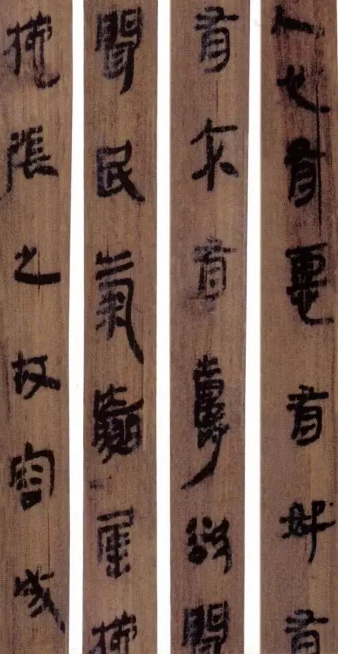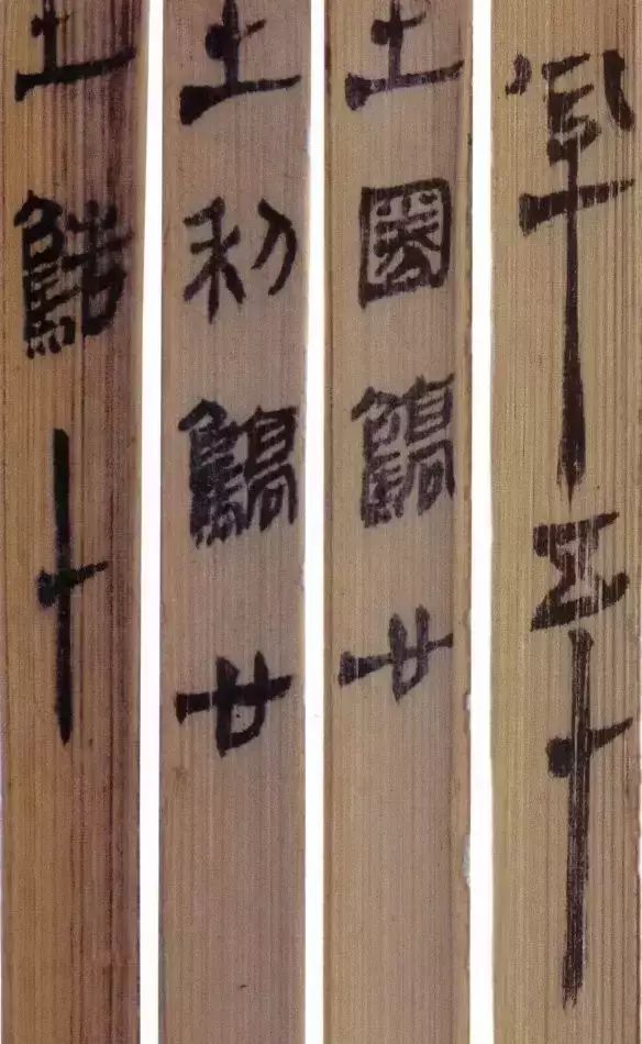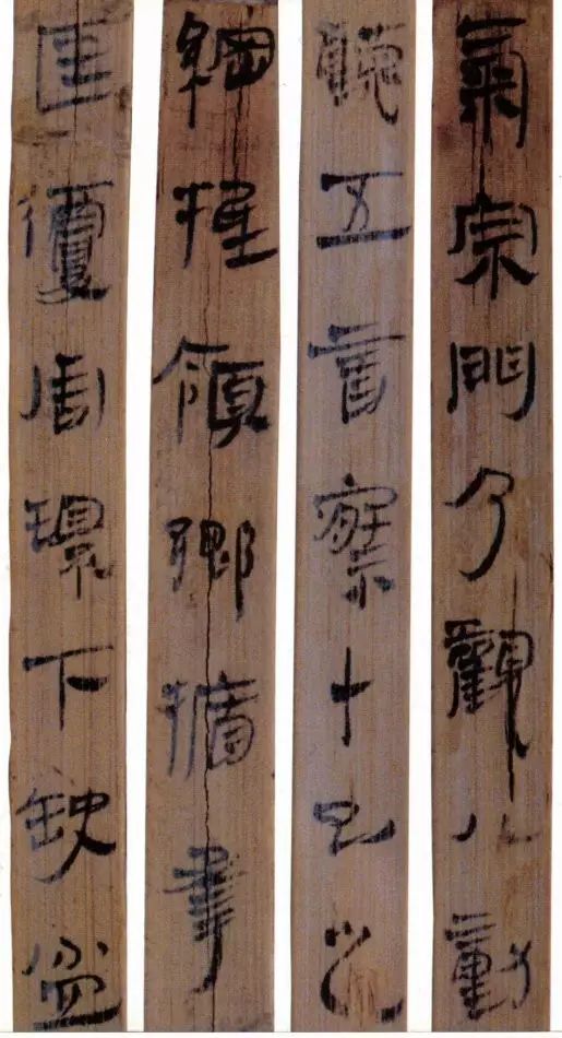 马王堆汉墓出土的大批帛书和竹简,在反映汉初文字的隶变情况方面最具代表性。《合阴阳》是马王堆三号墓出土的竹简。与《合阴阳》同墓出土的另有《十问》、《天下至道谈》、《杂禁方》、《遣策》等不同内容的四种简,还有其他内容的帛书。《合阴阳》一共有三二支简,简长为二三厘米左右,简宽为一厘米有余,每支简上的文字有二十余宇不等,其内容是对房中养生术具体技巧的描述,属于医简。这批简的简幅较宽,书写时便于发挥书法技艺。这批简的抄手在书法方面本身也有较高的造诣。这组简,从笔画上看,书写者颇能随心所欲地将刚柔不同的笔画揉合在一起。例如其横画,虽也如马王堆一号墓《遣策》上的文字一样,都讲究方起尖收,但在其方起处就往往兼有圆笔或点墨,其用笔就并不太着意于棱角的分明与否。至于其折笔则方圆并重,或一笔弯下,显其圆转流畅,或分笔相连,呈其刚劲遒健。从文字构形上看,其中宫紧凑,四周舒展,左右避让,上下呼应,顾盼有情。特别是其波挑披拂之处,神采飞扬,极尽波磔俯仰之能事,有一种变化奇丽的特殊意蕴。再从整体布局上看,其一简之内的黑白布局随立思自然,疏朗有致,毫无匠气而显得神采飞扬,赏心悦目。因此,无论从哪方面去品评,这批简的书法艺术都是汉简书艺中的上乘之作。