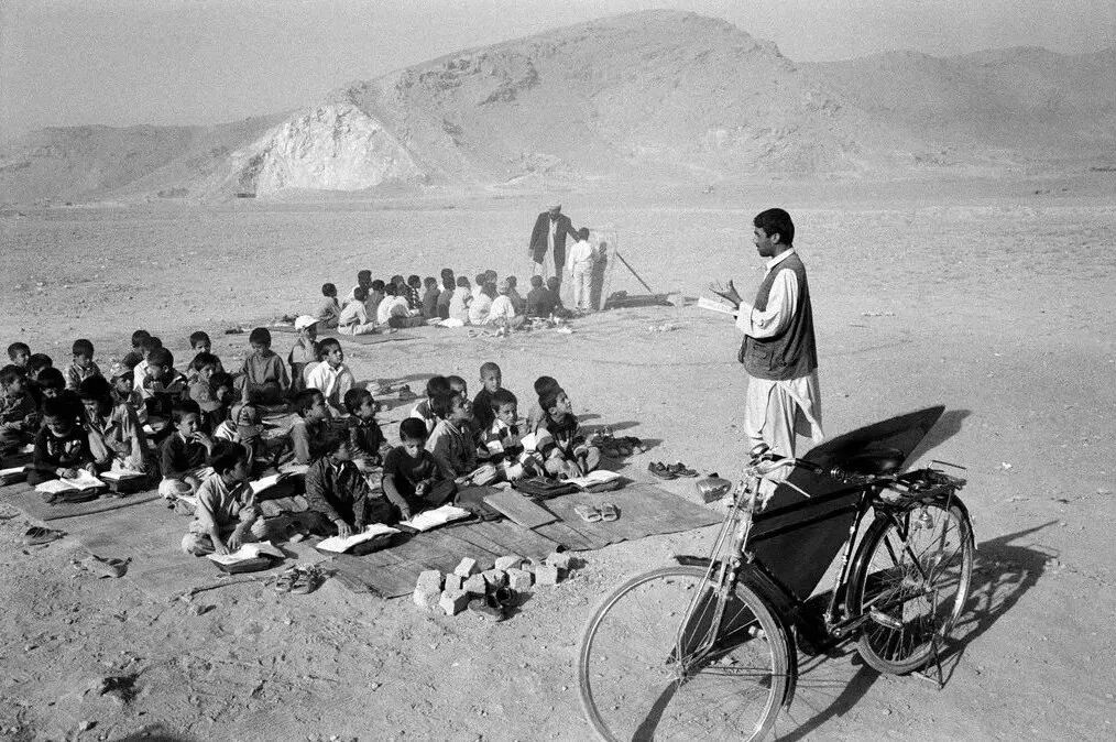 孩子们坐在空地上上课