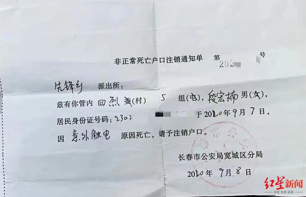 段宏楠死后,程女士得到涉及他死因的两份书面材料。2020年9月8日长春市公安局宽城区分局向先锋乡派出所出具《非正常死亡户口注销通知单》载明:“段宏楠于2020年9月7日因意外触电原因死亡”。2020年10月9日依安县先锋卫生院出具《居民死亡医学证明书》载明:“段宏楠2020年9月7日触电身亡”。