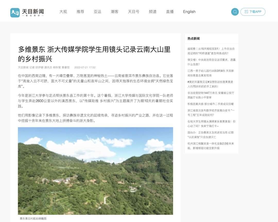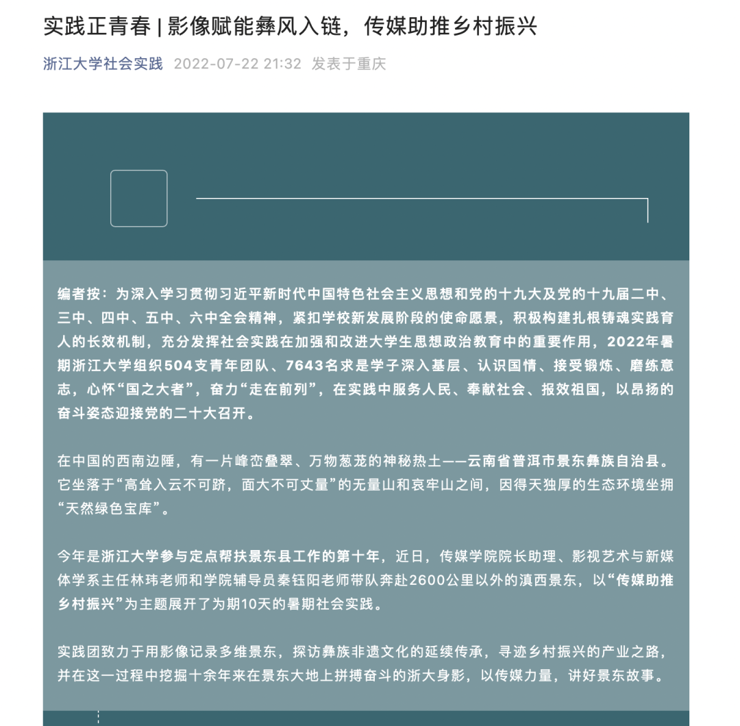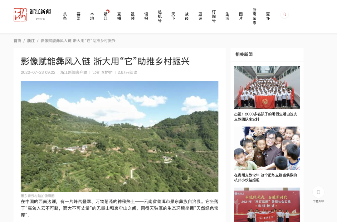 近日,浙江大学传媒与国际文化学院8位师生前往云南省普洱市景东彝族自治县,以“传媒助推乡村振兴”为主题展开了为期10天的暑期社会实践。今年是浙江大学参与定点帮扶景东县工作的第十年,浙大传媒学子在实践中用影像记录多维景东,探访彝族非遗文化的延续传承,寻迹乡村振兴的产业之路,并在这一过程中挖掘十余年来在景东大地上拼搏奋斗的浙大身影。