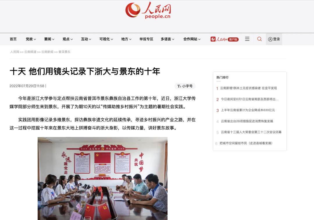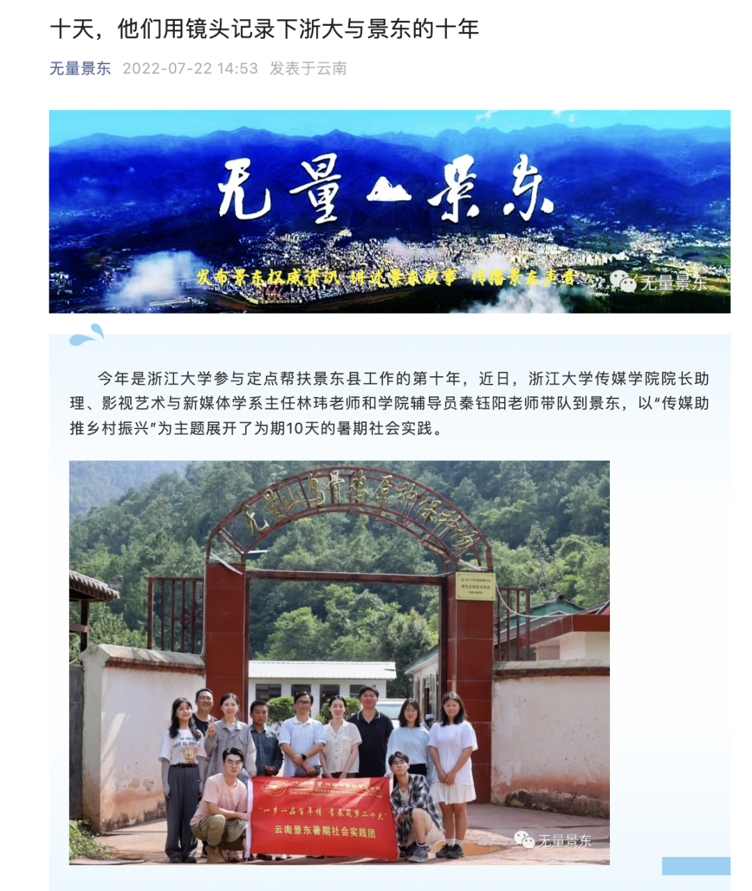 其中,由传媒学院院长助理、影视艺术与新媒体学系主任林玮老师和学院辅导员秦钰阳老师带队的赴云南景东“传媒助推乡村振兴”实践团队获得了新华网、人民网、浙江新闻、杭州日报、天目新闻、小时新闻、无量景东等中央、省级、地方媒体的报道,引起了热烈反响。