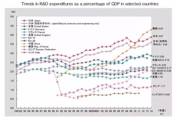 中国2014年R&D研发投入占GDP比例为2.05%,和欧盟28国平均的2.08%差不多,超过了英国的1.72%。日本是3.87%,日本在世界主要国家中仅次于韩国的4.29%。