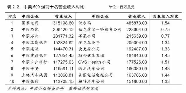 2017年世界企业500强中,中国上榜公司达到115家,其中中国大陆(含香港在内,不包括台湾地区)109家,美国有132家公司上榜。从企业所属行业结构看,中国的上榜企业主要集中在金融业、能源、炼油、采矿公司和房地产行业,而美国企业的行业分布更为多元,除了金融、能源类企业,电子、通信、装备制造等行业均有企业上榜。2017年中国企业500强实现营业收入64.0万亿元,约合9.63万亿美元(按照世界500强核算汇率6.6433进行折算,下同);美国企业500强总营业收入达12.06万亿美元。总体来看,在大型公司这一企业群体的比较中,中国企业500强的营业收入为美国企业500强的79.85%,仍有较大追赶空间。