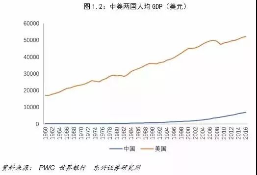 从GDP总量来看,根据世界银行公布的数据,按现价美元计算,2016年中国的GDP为11.20万亿,居世界第二,美国为18.57万亿,尚有7.37万亿的差距,我们预测中国的经济总量超过美国仍需十年以上的时间。